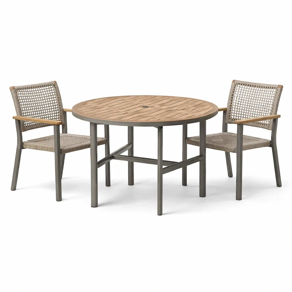 Dieses Set besteht aus einem Rundtisch und zwei Stühlen. Die Tischplatte ist aus Teakholz, und der Rahmen der Stühle besteht aus Aluminium. Sitz und Rückenlehne sind aus Kunststoffgeflecht. Der Tisch hat einen Durchmesser von 120 cm und eine Höhe von 75 cm, mit einem Gewicht von 15 kg. Jeder Stuhl hat eine Höhe von 90 cm und wiegt 5 kg. Das Set ist wasserfest.